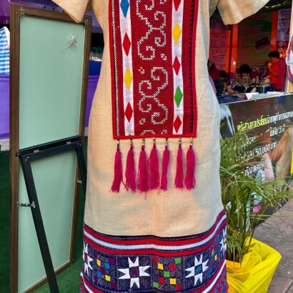 ชุดเดรสลายผ้าปักม้ง เนื้อผ้าใยกันชง ตกแต่งด้วยลายอัตลักษณ์ผ้าปักม้ง (บ้านไทรงาม ตำบลสบบง อำเภอภูซาง จังหวัดพะเยา)