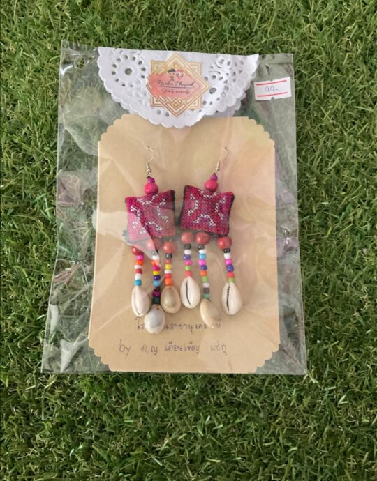 ตกแต่งด้วยลายผ้าปักม้ง พู่ไหมพรม และกระดุมเงิน