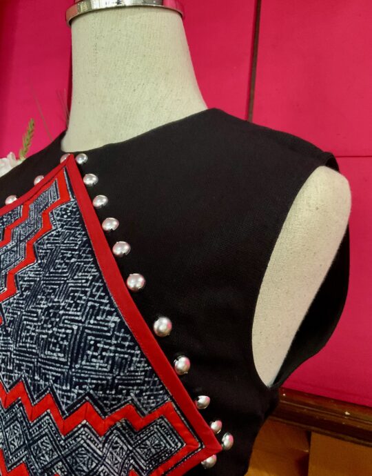 เสื้อใยกันชงแขนกุด ตกแต่งด้วยหมุดเงินและผ้าเขียนเทียน (บ้านม้งใหม่ ตำบลผาช้างน้อย อำเภอปง จังหวัดพะเยา)