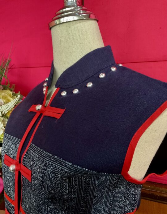 เสื้อใยกันชง แขนกุด คอจีน ตกแต่งด้วยหมุดเงินและลายผ้าเขียนเทียน (บ้านม้งใหม่ ตำบลผาช้างน้อย อำเภอปง จังหวัดพะเยา)