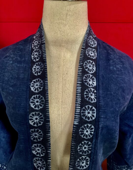 เสื้อคลุม ย้อมสีด้วยฮ่อม ตกแต่งด้วยลายผ้าเขียนเทียน (บ้านสิบสองพัฒนา ตำบลผาช้างน้อย อำเภอปง จังหวัดพะเยา)