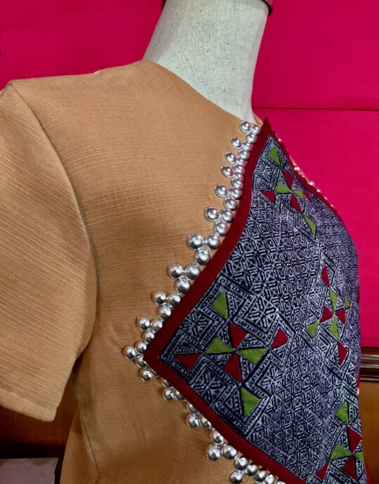 ตกแต่งด้วยลายผ้าปักม้ง พู่ไหมพรม และกระดุมเงิน